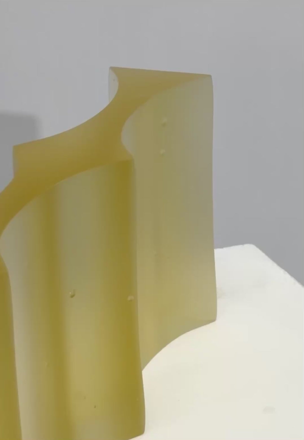 Gradient is taken from Lola Lazaro Hinks' Architectural Fragments series which is drawn from the pervasive use of transparent glass in modern architecture, and from an inquiry into why transparency has come to function as an ideal within contemporary society. Glass is often used to project utopian narratives of connection and openness. Yet this clarity is intrinsically bound to exposure, surveillance, and control—forces that flatten human presence by reducing it to a visible surface. Through her fragments, she works to soften this tension, allowing the material to move, sag, and settle on its own terms. Depth and tonal colour introduce obscurity, while control is loosened through remelting the glass.