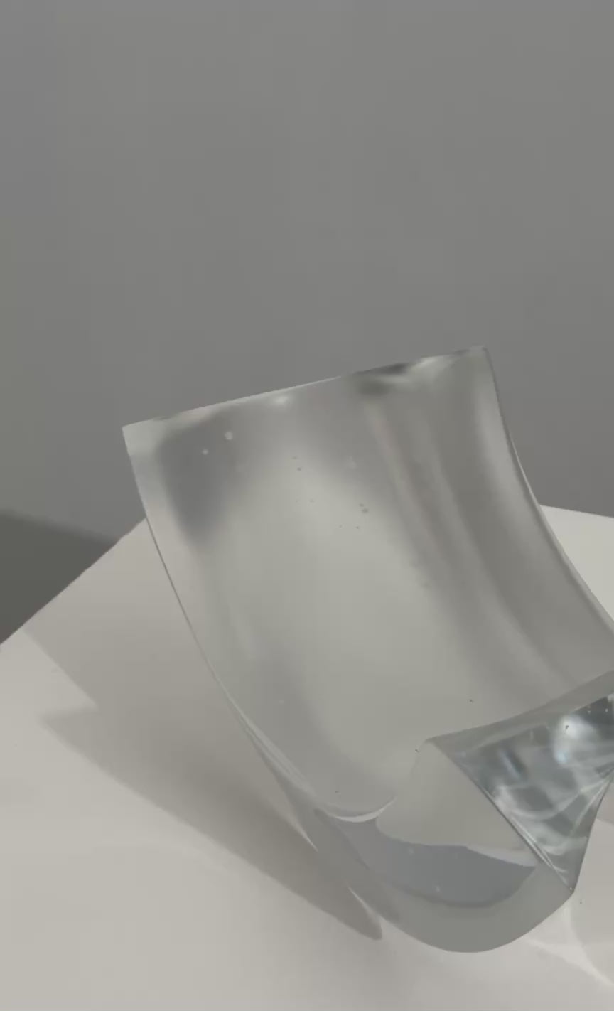 Horizon Line is taken from Lola Lazaro Hinks' Architectural Fragments series which is drawn from the pervasive use of transparent glass in modern architecture, and from an inquiry into why transparency has come to function as an ideal within contemporary society. Glass is often used to project utopian narratives of connection and openness. Yet this clarity is intrinsically bound to exposure, surveillance, and control—forces that flatten human presence by reducing it to a visible surface. Through her fragments, she works to soften this tension, allowing the material to move, sag, and settle on its own terms. Depth and tonal colour introduce obscurity, while control is loosened through remelting the glass.